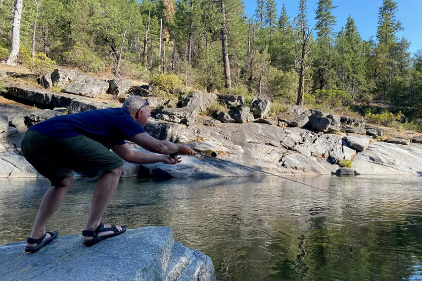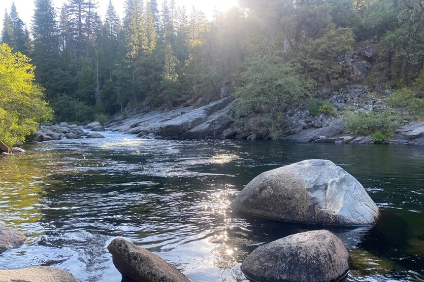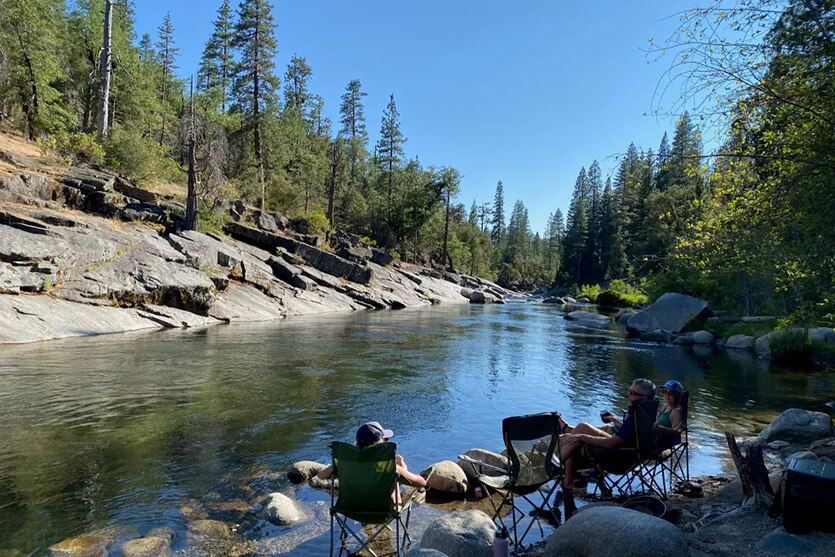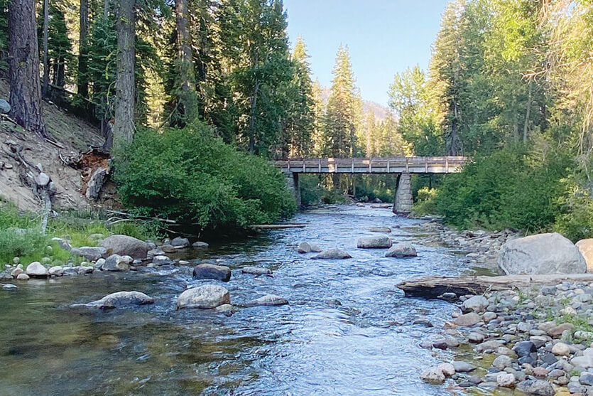 At Boards Crossing, the Middle Fork Stanislaus River carves a granite gorge lined with sugar pines and incense cedars. A one‑lane truss bridge marks the spot where locals soak, sun, and launch spring white‑water runs.